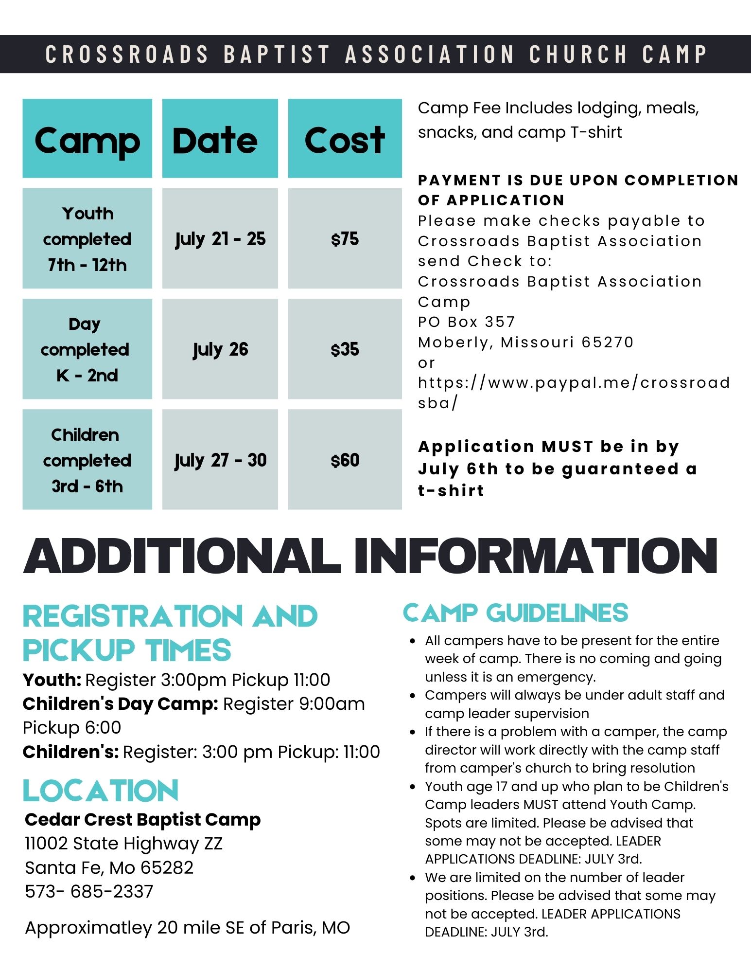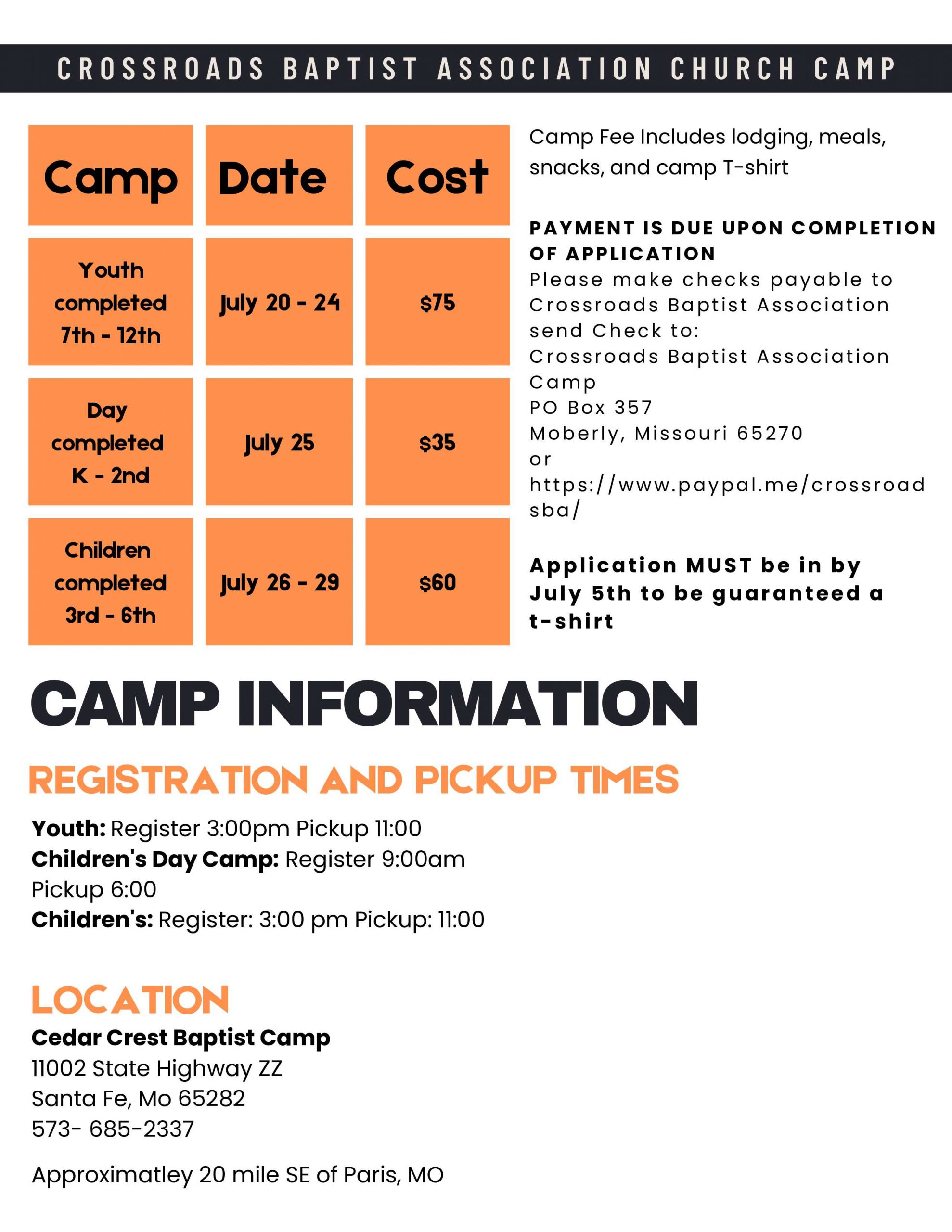 Youth and Children’s Camp Camp Leadership Application Campers Registration Form Printable Camp Registration Camp Donation List And Sign-Up Part 1 Camp Donation List And Sign-Up Part 2 Camp Kitchen Help Signup